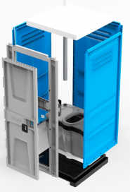 Стандартная комплектация: накопительный бак, сиденье с крышкой, пластиковый поддон, запирающее устройство с индикацией "Свободно-Занято", антивандальное крепление двери, вентиляционная труба, универсальные ушки для навесного замка, держатель для туалетной бумаги, крючок для одежды.