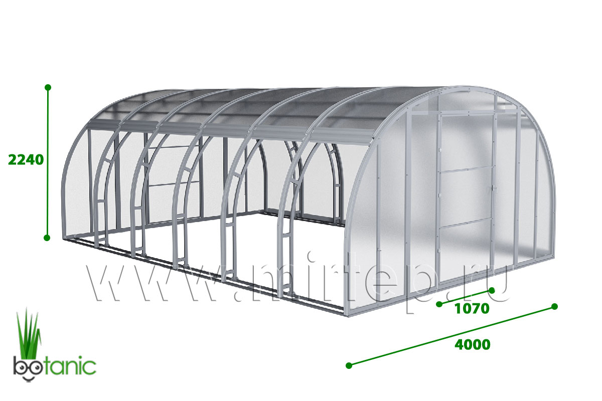 Для удобства транспортировки торцы и дуги изготавливаются разборными. Высота теплицы составляет 2,24 м, ширина 4 м, длина 3,988; 5,952; 7,916; 9,88 метров и т. д. (в качестве удлинения теплицы используются доборы ~ 1,964 м).